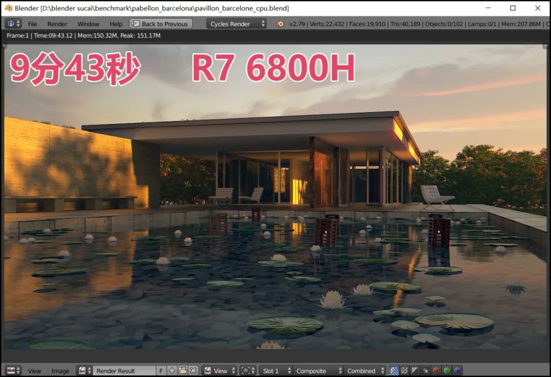 ▲巴塞罗那馆样张,渲染耗时相对较长,i5 12500H耗时10分3秒;R7 6800H为9分43秒,终于微幅胜出。