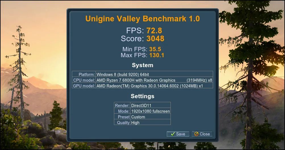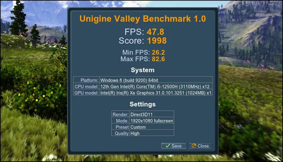 ▲Unigine Valley是展现集显的游戏3D性能差异的不错测试工具,老读者应该知道,80EU的Iris Xe可跑45fps左右,i5 12500H款Neo 14的47.8fps已是同配置机型中的佼佼者。但与R7 6800H的12核心Radeon 680M相比,依然有较大差异。