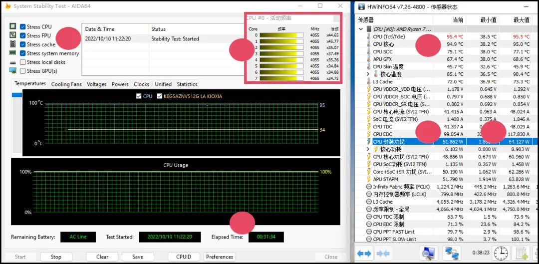 ▲锐龙R7 6800H款Neo 14的处理器考机时爆发功率64W,但很快走低,第28秒就走低到52W,然后一直在52W~54W微幅波动,频率为稳定的全核4.05GHz,处理器内部温度在95℃左右保持稳定。
