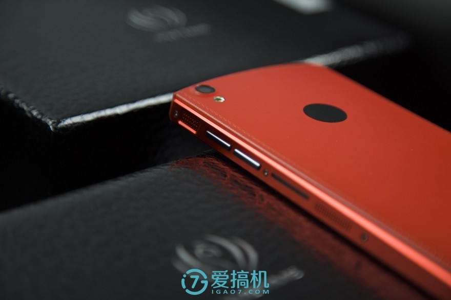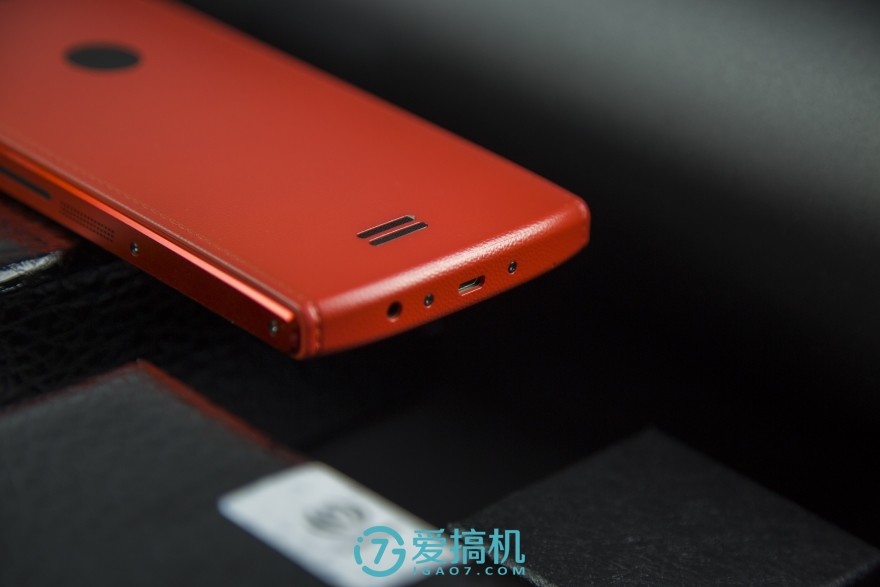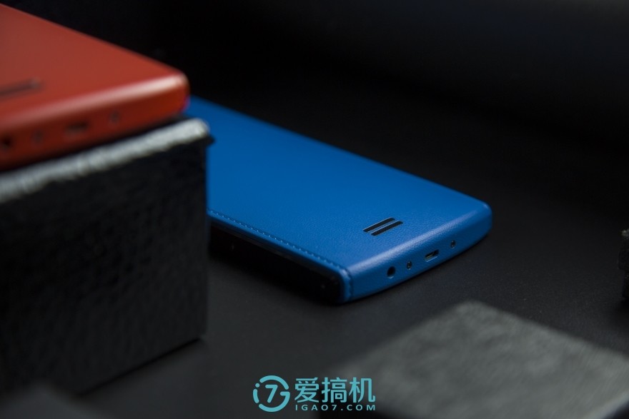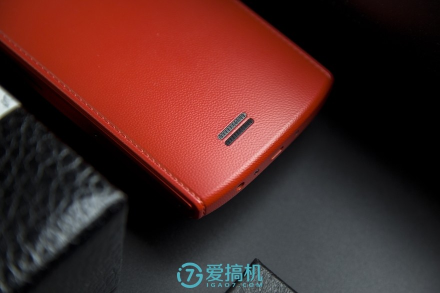 背部的两侧边缘采用了车线缝合,车线与后盖为同色,做工扎实,在沉稳当中增加了一丝对称美。机身靠下的位置是扬声器开孔,双开孔可以在一定程度上避免扬声器被掩盖。