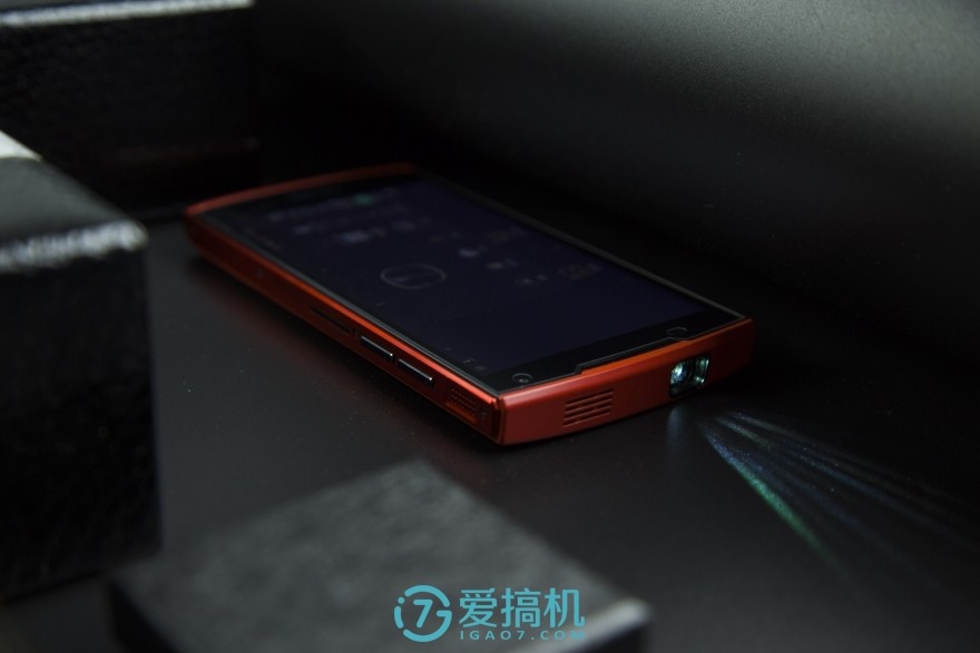 边框右侧的设计就比较复杂了,与左侧类似,同样有两个按键,不过功能大不相同,下方的按键为电源按键,上方的按键则是一键启动投影功能的专属“投影按键”,这也是它比较特别的地方。按键的下方为SIM卡槽,表面为黑色设计。边框顶部则同样有辅助散热的进气孔。