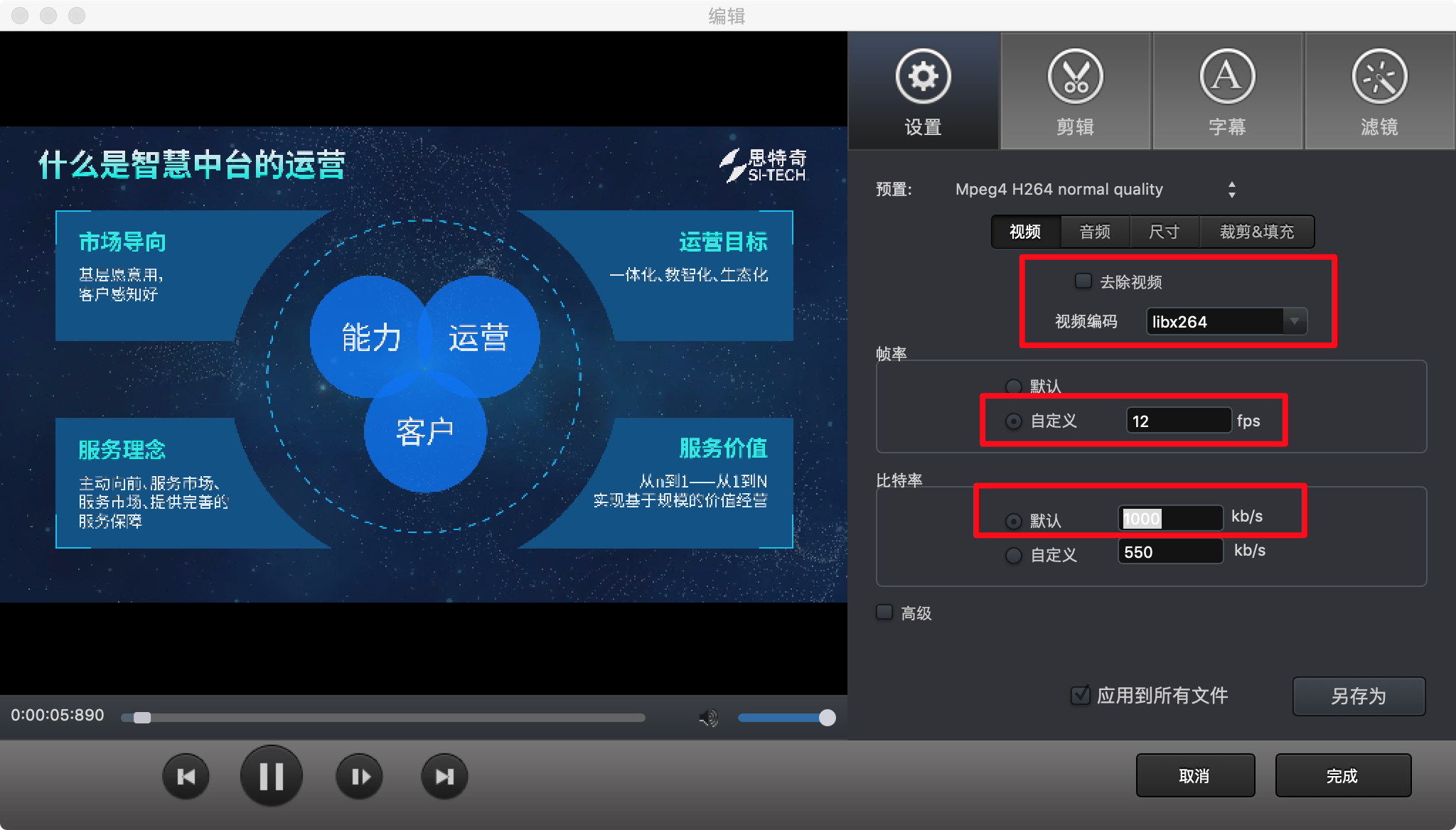 2、通过Total Video Converter Pro进行压缩(可以压缩两次,先压缩一个高质量的,再通过高质量的压缩一个超小文件的),压缩配置如下:主要修改视频编码方式/帧速率/比特率