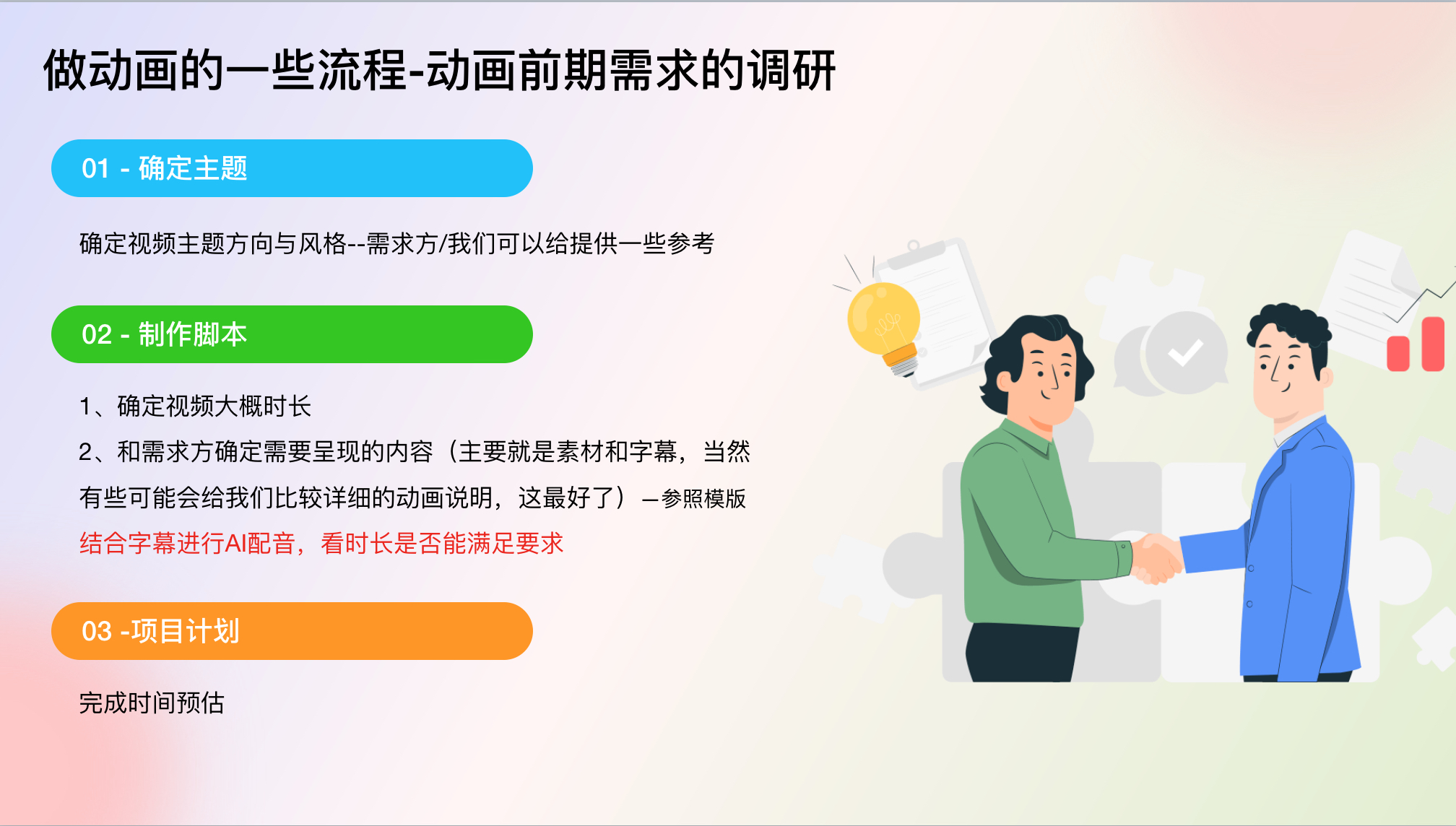 2、制作脚本(需求方确定需要呈现的内容(主要就是素材和字幕,当然有些可能会给我们比较详细的动画说明,这最好了),包括视频时长/需要我们最后做一下把关,预估时间是否可行--一般就是将字幕进行AI配音,看时长是否能满足要求)---参照模版
