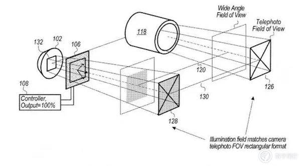 实际上,苹果申请一项更为激进的闪光灯专利,通过马达控制内部透镜移动,改变光线的发散角度,从而实现不同效果的打光。但,这项方案最终未能落地,或许是闪光灯模组体积限制。