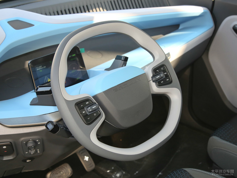 和外观一样,欧拉R1也深谙女性的心理,它清楚地知道女性驾驶员特别讨厌复杂的机械操作,所以其内饰设计十分简洁,线条简单流畅,几乎没有机械按键。集成了启动和换挡功能的圆形旋钮非常有趣,仪表盘、空调出风口等部件也都设计成圆形,方向盘的造型实际上也可以看做是一个同心圆与三幅式托柄的结合,看上去很有辨识度。总体来说,欧拉R1的内饰风格不再像外形那么呆萌,而是更时尚了。