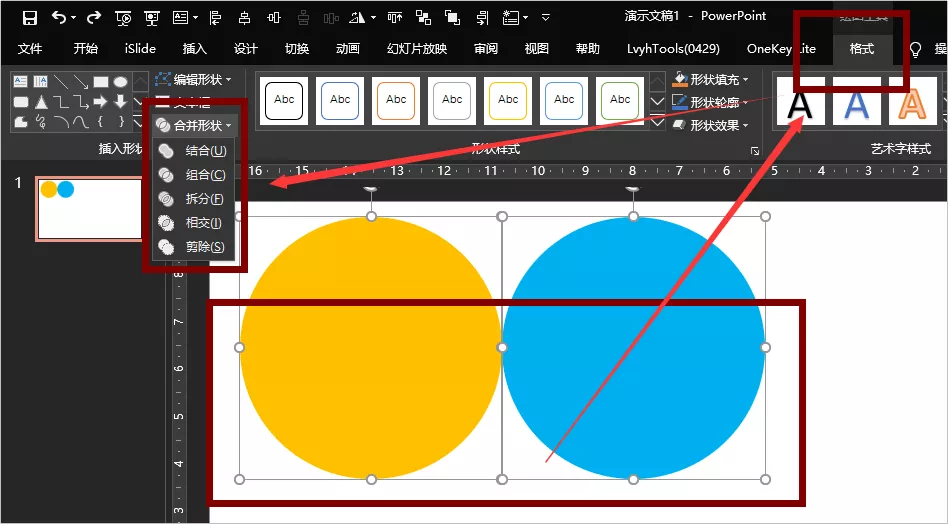 通俗来讲,在PPT中的“布尔运算”指的是,在【格式】选项卡下【合并形状】中的【结合、组合、拆分、相交、减除】这五个图形处理的按钮。