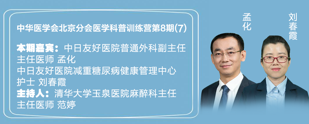 孟化:健康宣教其实涉及到我们国家社会层面,其实是一个社会问题,大家都认为肥胖不是病,其实世界卫生组织很早就把肥胖定义为一种疾病,严重的缩短了我们的寿命。在糖尿病方面也是不容乐观的。我们中国有1.139亿糖尿病人群,4.9亿糖耐量异常的人,所以有6亿人口血糖是不正常的。在6亿血糖不正常的人里面,7000万是合并肥胖,所以这些7000万的患者可能目前急需要我们去医疗干预。