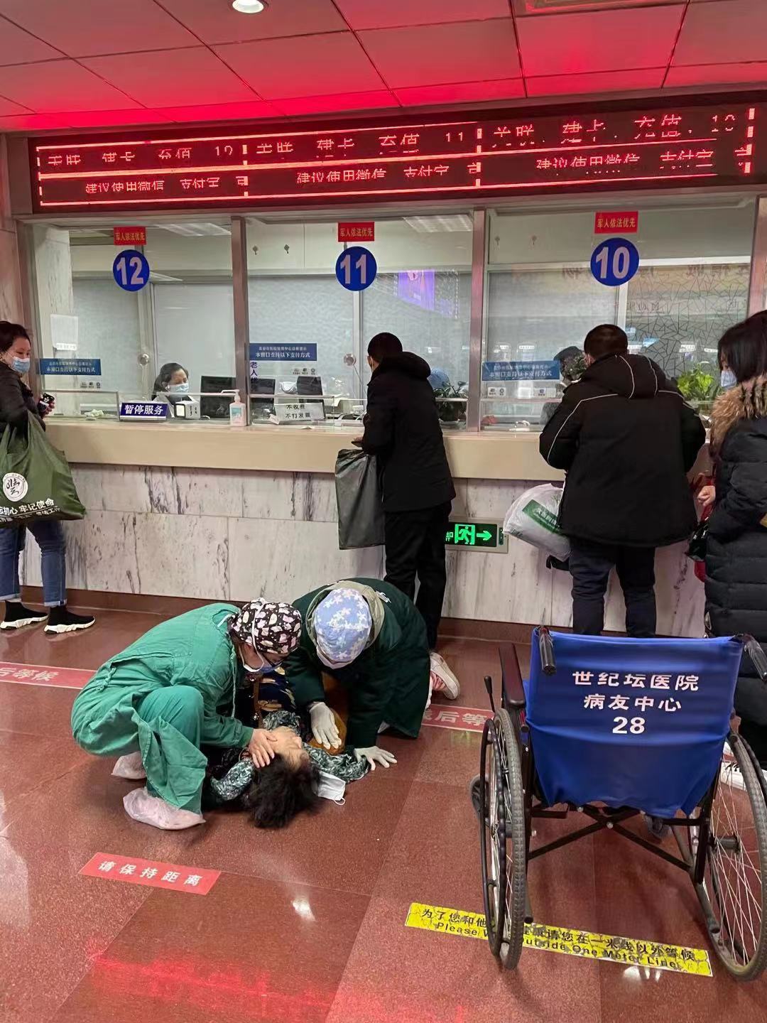 今年年初,病人在门诊大厅晕倒,导医在配合急诊科医生对其进行抢救。受访者供图