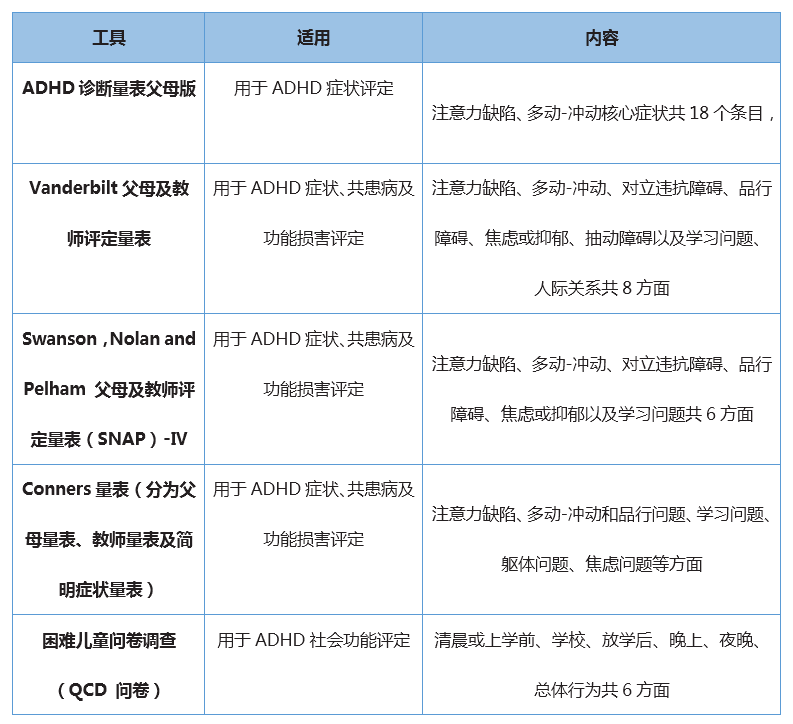 注:此外,初诊除据情况选择症状、共患病、功能损害评定工具进行评估以外,还应进行认知能力评估;特别需要注意的是6岁以下儿童诊断ADHD应谨慎,筛查阳性者可列为监测对象监测、随访,暂不轻易诊断。