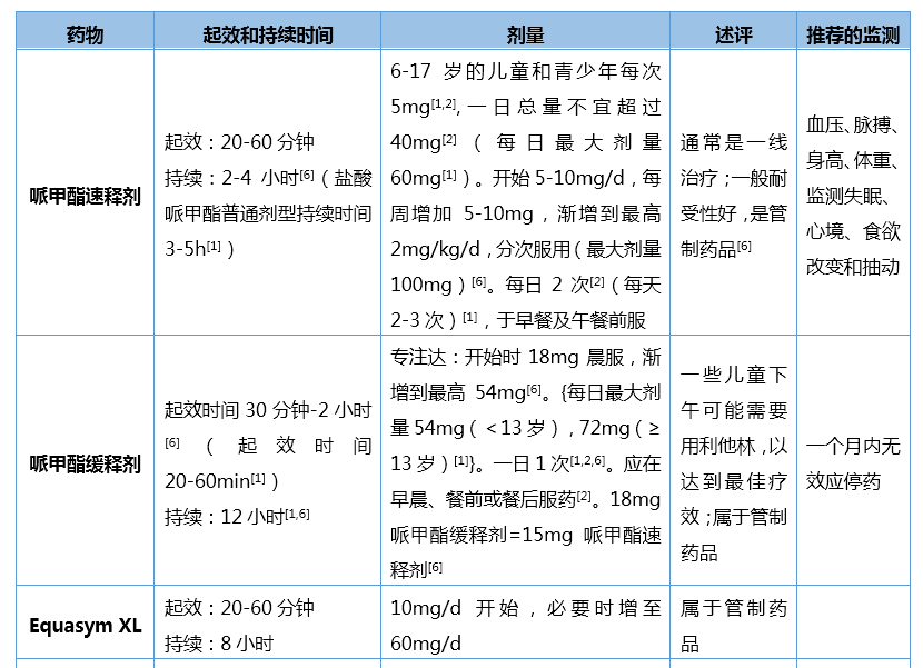 ①中枢兴奋剂常用的有哌甲酯和安非他明。我国目前仅有哌甲酯类制剂,为一线治疗药物。