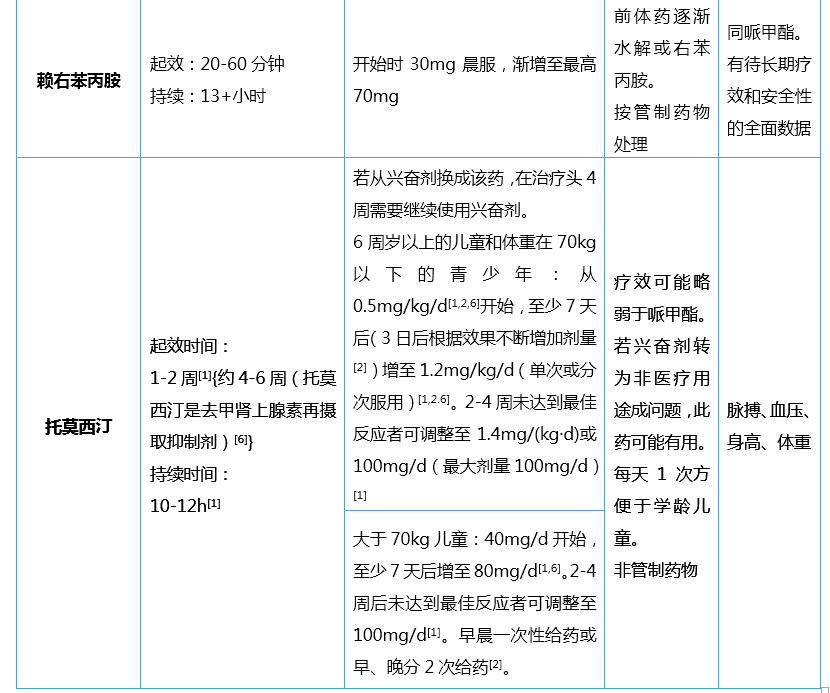 (2)6岁以下儿童原则上不推荐药物治疗,仅在症状造成多方面显著不良的影响时才建议谨慎选择药物治疗;治疗期间除随访疗效以外,还需随访药物不良反应、定期监测体格生长指标、心率、血压等;症状完全缓解1年以上可考虑减量及停药。