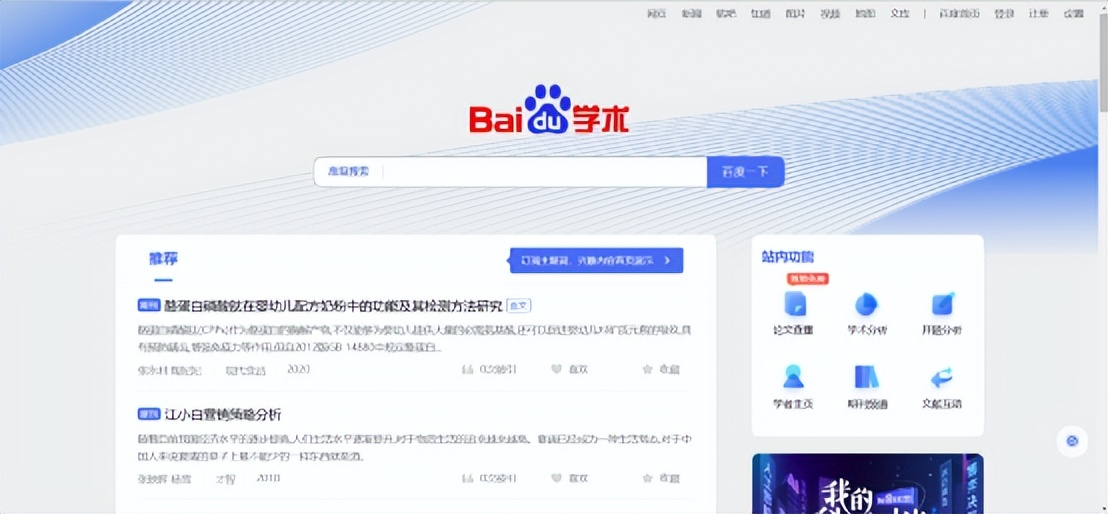 百度学术搜索是百度旗下的提供海量中英文文献检索的学术资源搜索平台,2014年6月初上线。涵盖了各类学术期刊、会议论文,旨在为国内外学者提供最好的科研体验。个人觉得文献互助、论文查重和开题分析做得还不错,比较推荐。