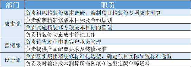 例如某标杆房企对于精装成本管理,就对不同部门的职责进行了清晰的界定。营销、设计部门要基于成本部编制的目标成本明确精装标准和设计选材,这样一来,每个部门相互配合,相互协调,最终共同实现成本管理。