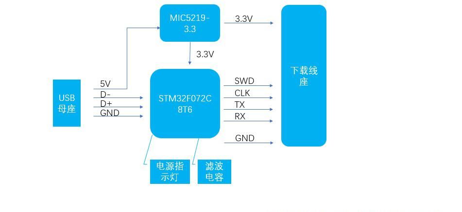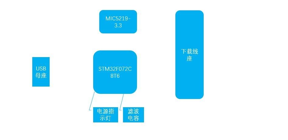 ①5V是电源正极,由于STM32F072C8T6单片机的供电要求是三.3V,那么很明显5V电压高了,直接给单片机供电会将单片机击穿损坏。因此须要将5V电压降到三.3V,其次才给单片机供电。也就是上图中的MIC5219-三.3这款降压芯片,一般专业属于叫做LDO也叫做线性稳压器。