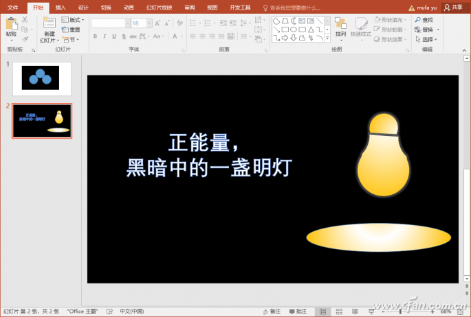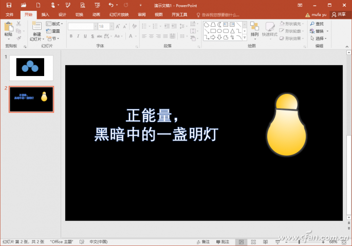 在很多摄影作品中我们都可以看到高光效果,通过明暗对比制造出更醒目的效果。在PPT设计中,借助PPT组件也可以轻松打造出高光效果。比如我们要在幻灯片中表达“正能量是黑暗中明灯“”这样的主题,就可以利用PPT打造一个高光的明灯。