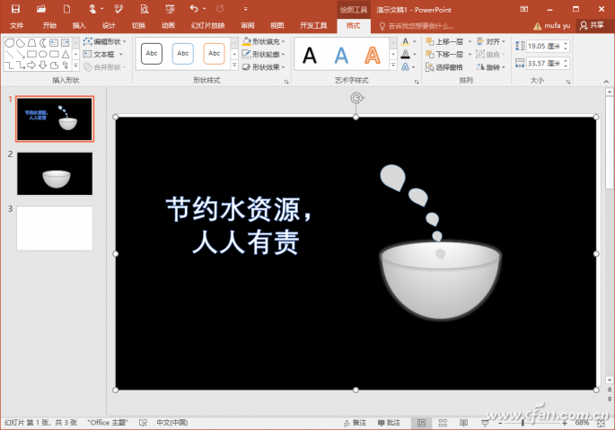继续点击“插入→形状”,插入水滴形状按住Ctrl复制并调整插入水滴大小,将其形状填充为白色。排列好水滴形状后和碗状形状组合,最后添加上文字说明,这样一张表达节水资源的高光效果幻灯片即可完成(图10)。