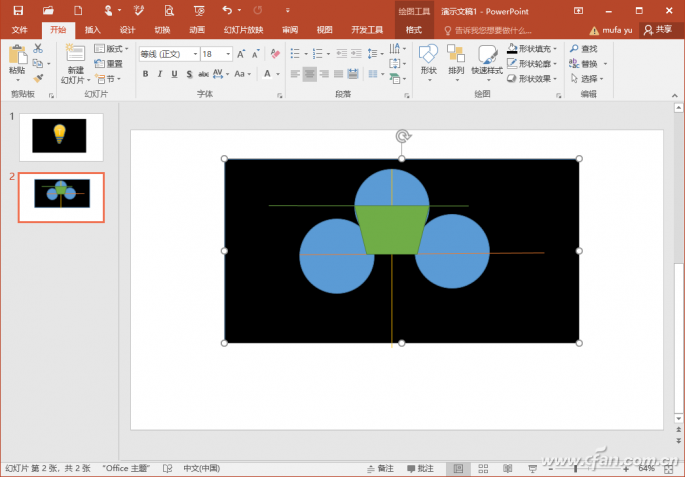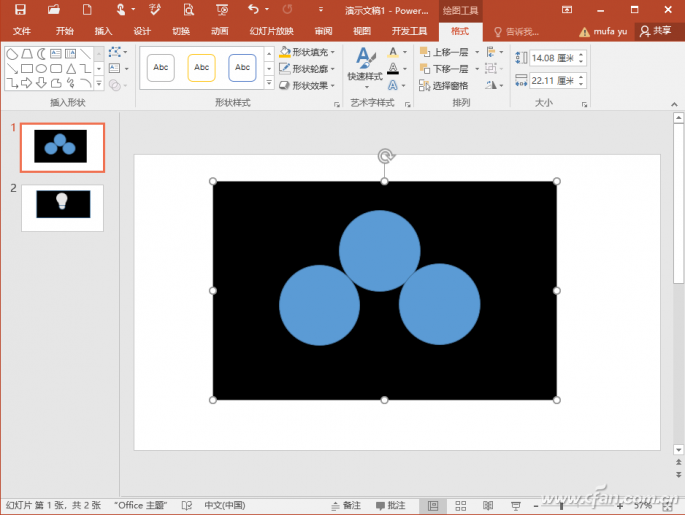 为了获得更好的高光效果,在幻灯片中点击“插入→形状”,按提示插入一个矩形,并将其填充为黑色作为背景色。操作同上,按住Shift插入一个椭圆并调整为合适大小的圆形,按住Ctrl键复制2个插入圆形,同时将三个圆形相切排列(图1)。