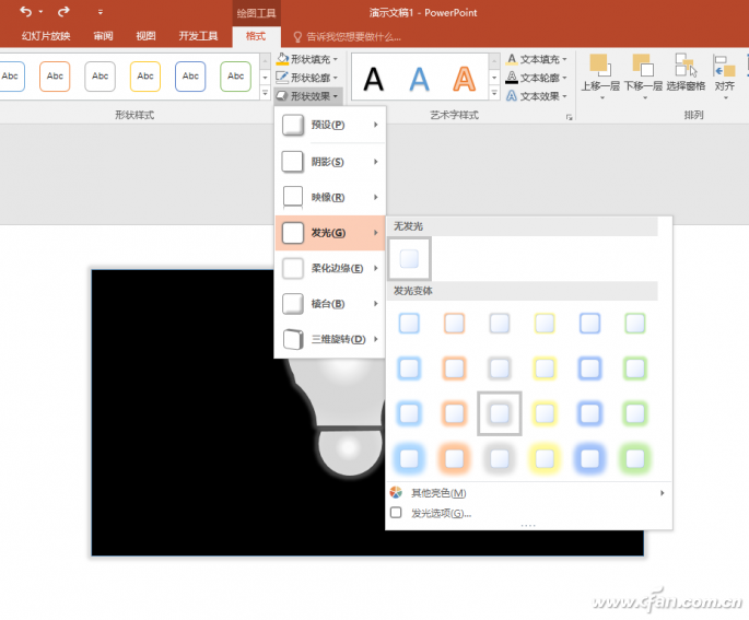 继续选中组合体,点击“绘图工具→形状效果→发光→预设→灰色发光体”,这样灯泡就具有发光的效果了(图6)。