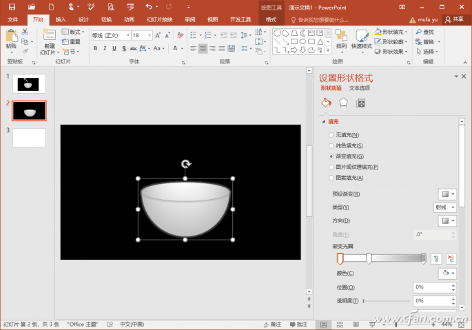 借助布尔运算和对形状的渐变填充+发光效果,我们可以举一反三制作出各种高光效果。比如要制作一个节约水资源的主题PPT,同上插入一个矩形和圆形,然后选中两个形状的执行剪除操作可以获得一个半圆形状,接着再插入一个椭圆到半圆形的上方并组合。剩下操作同上,为组合形状添加灰色渐变填充色和发光效果,这样可以制作成一个高光的碗状形状(图9)。
