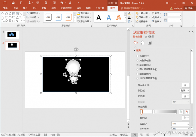 上述操作获得了灯泡的形状,为了让这盏明灯更吸引用户注意,下面可以为其添加高光效果。选中组合形状右击选择“设置形状格式→形状选项→渐变填充”。预设渐变选择“顶部聚光个性色3”,类型选择“射线”,方向选择“从中心”,同时调整渐变光圈使得内部发光效果更好,这样可以实现中心亮灯的效果(图5)。