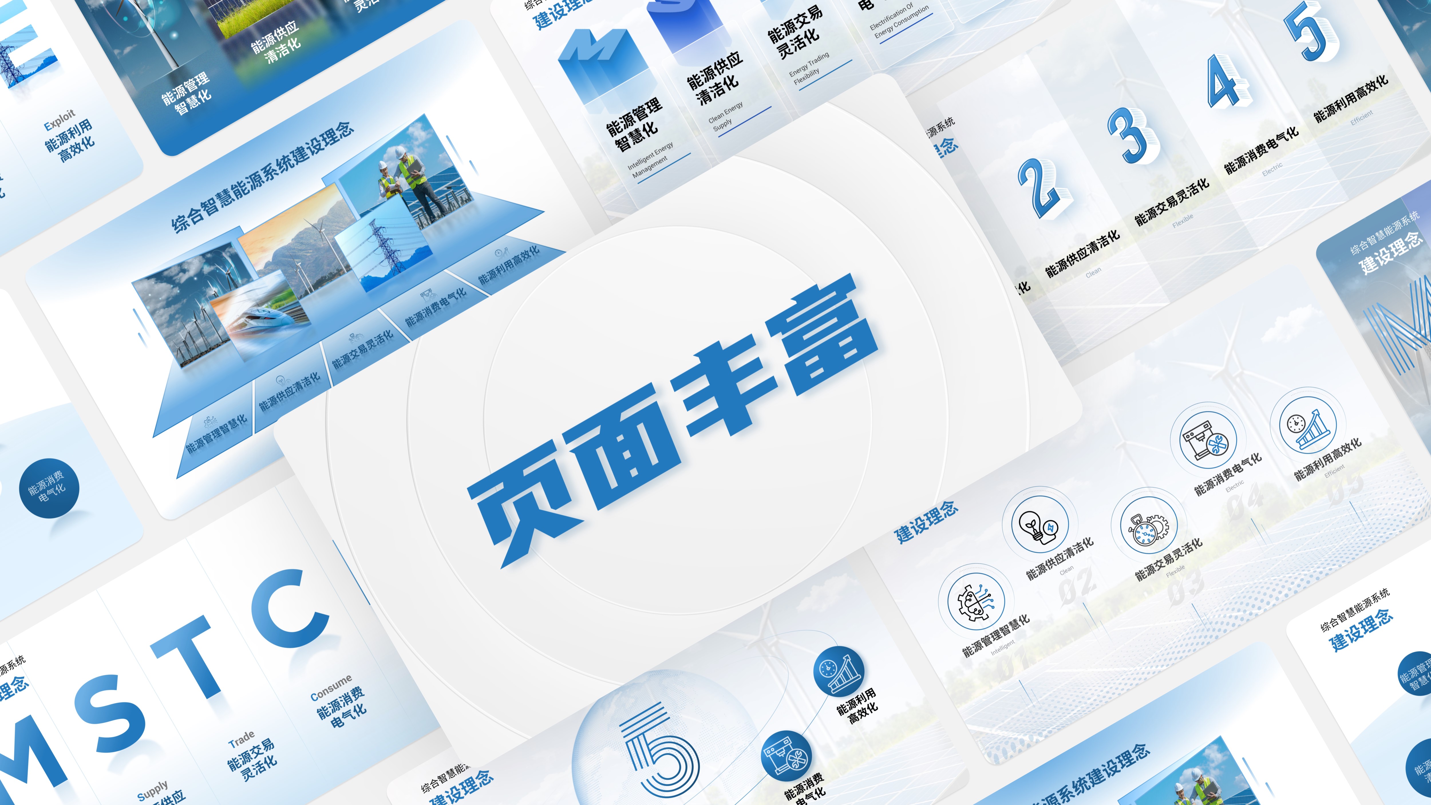 这里将页面分为五部分,然后统一色调,添加渐变蒙版,作为背景。提取关键词英文首字母,使用特殊字体,添加渐变,增加可视化,然后排版好文字。如图