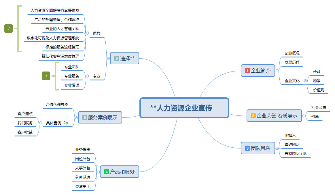 4.传递出去的是一种担当,一份稳重,更是一份厚重的,是对合作伙伴的承诺,也是一种社会责任如何设计一份合格的宣传册, 大家可以看下我的思路某人力资源公司 企业宣传册的脑图企业概况:概况 历程 文化 理念荣誉资质:企业实力 责任 荣誉展示团队展示:以人为本,人才是企业的核心产品服务: 精简扼要介绍服务案例:核心价值,给客户带来什么 选择我们:优势,专业这样思路下来, 整个企业的宣传册,是不是很清晰了