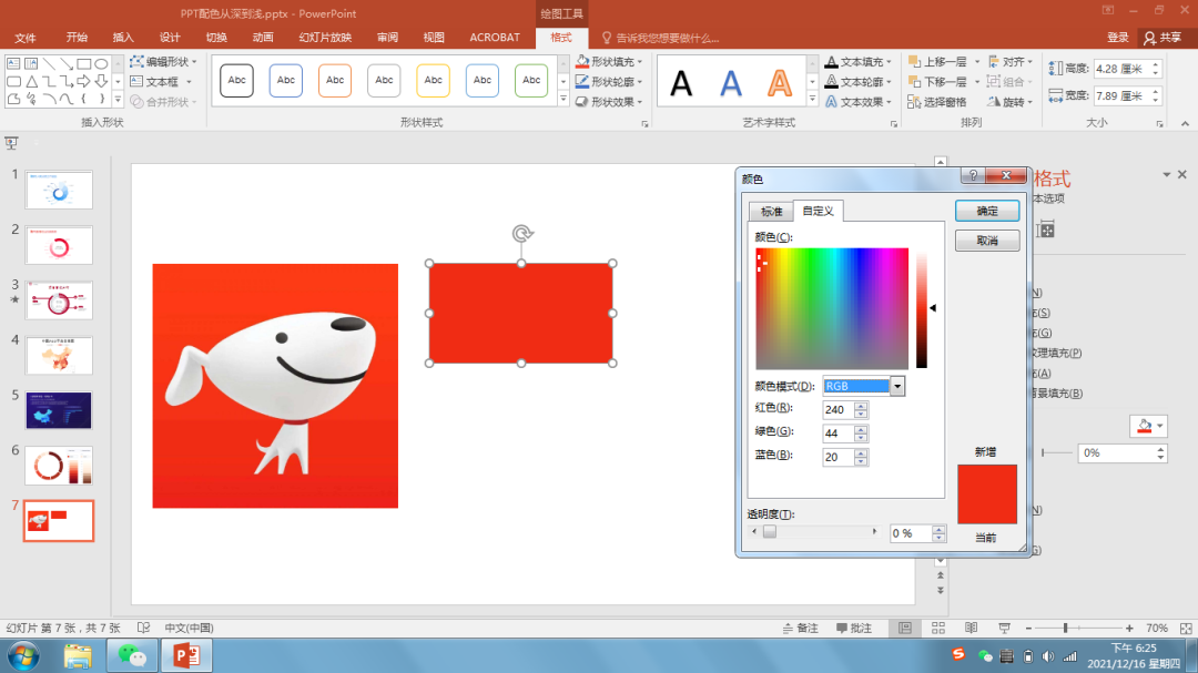 Windows: 绘制一个矩形,填充吸色为logo里的红色,然后再点击填充颜色中的“其他颜色” → 自定义 → 颜色模式“RGB”,Windows系统里的颜色只有RGB的参数,不会自动显示十六进制的代码,所以需要去网上在线转换一下。