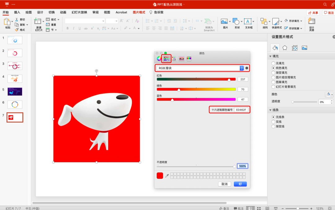 Mac: 打开图片格式的设置窗格,填充 → 颜色 → 其他颜色 → RGB滑块 → 吸色棒点击一下logo上的红色,我们可以看到这个红色的十六进制代码是:ED462F。