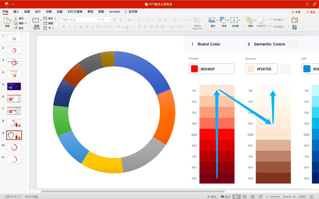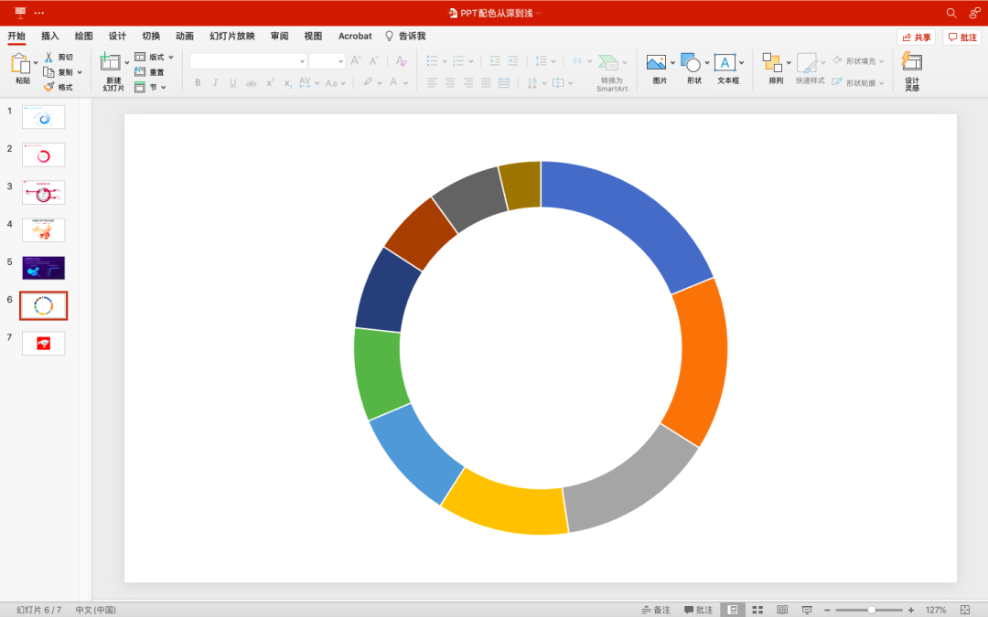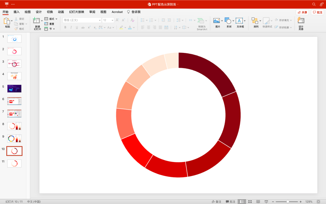 06. 下载后,把图片复制到PPT里,红色从深到浅一共13个颜色,可以根据自己的喜好和图表模块的个数,选择一个颜色作为起点,逐个选中圆环图的区域,吸色填充。