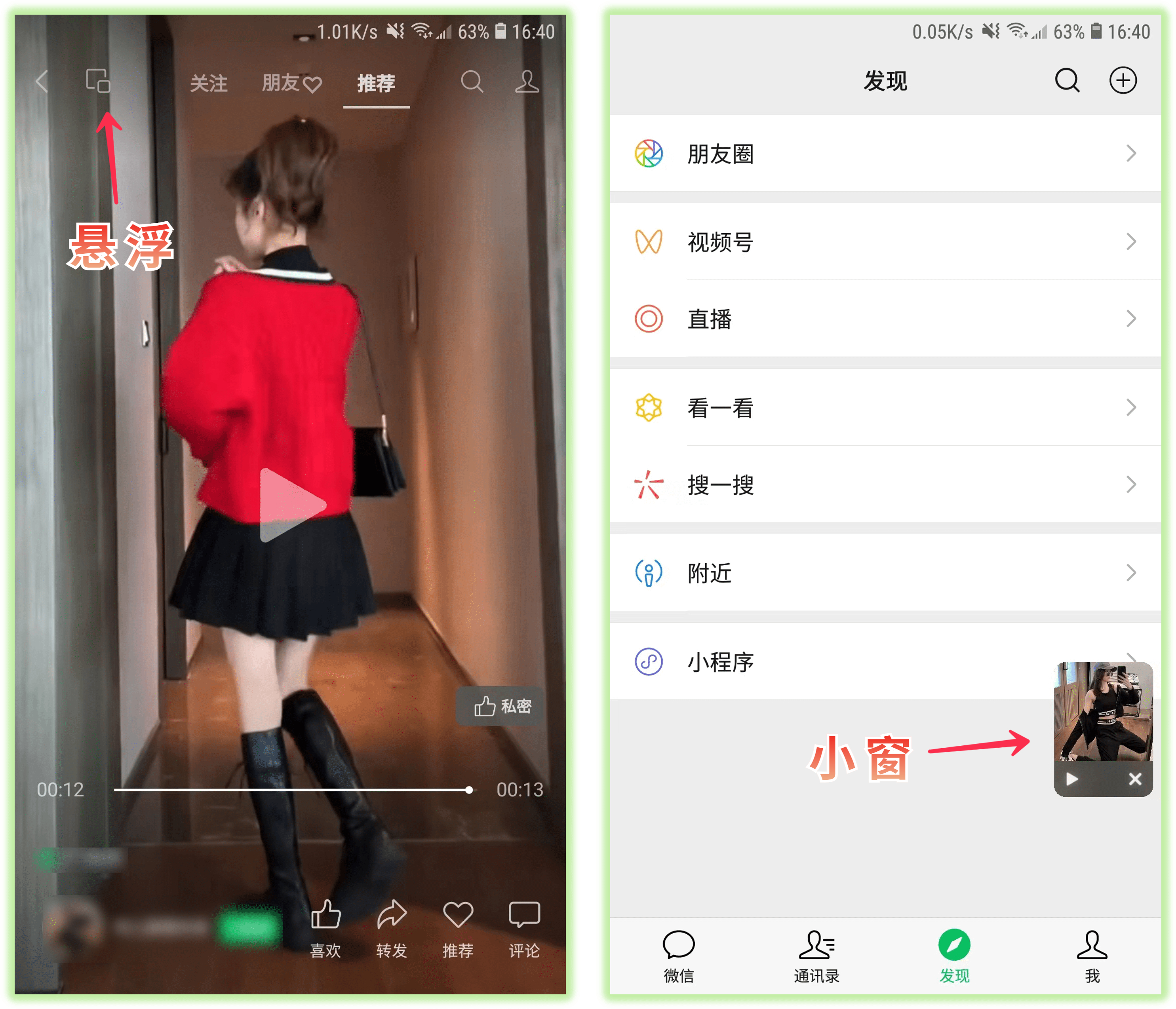 观看微信视频号时,左上角的缩放按钮,现在变成小窗按钮,点击后可以将当前视频变成悬浮窗,便于查看回复消息。小窗模式下,关闭按钮被移到了下方,窗口也变成圆角矩形。