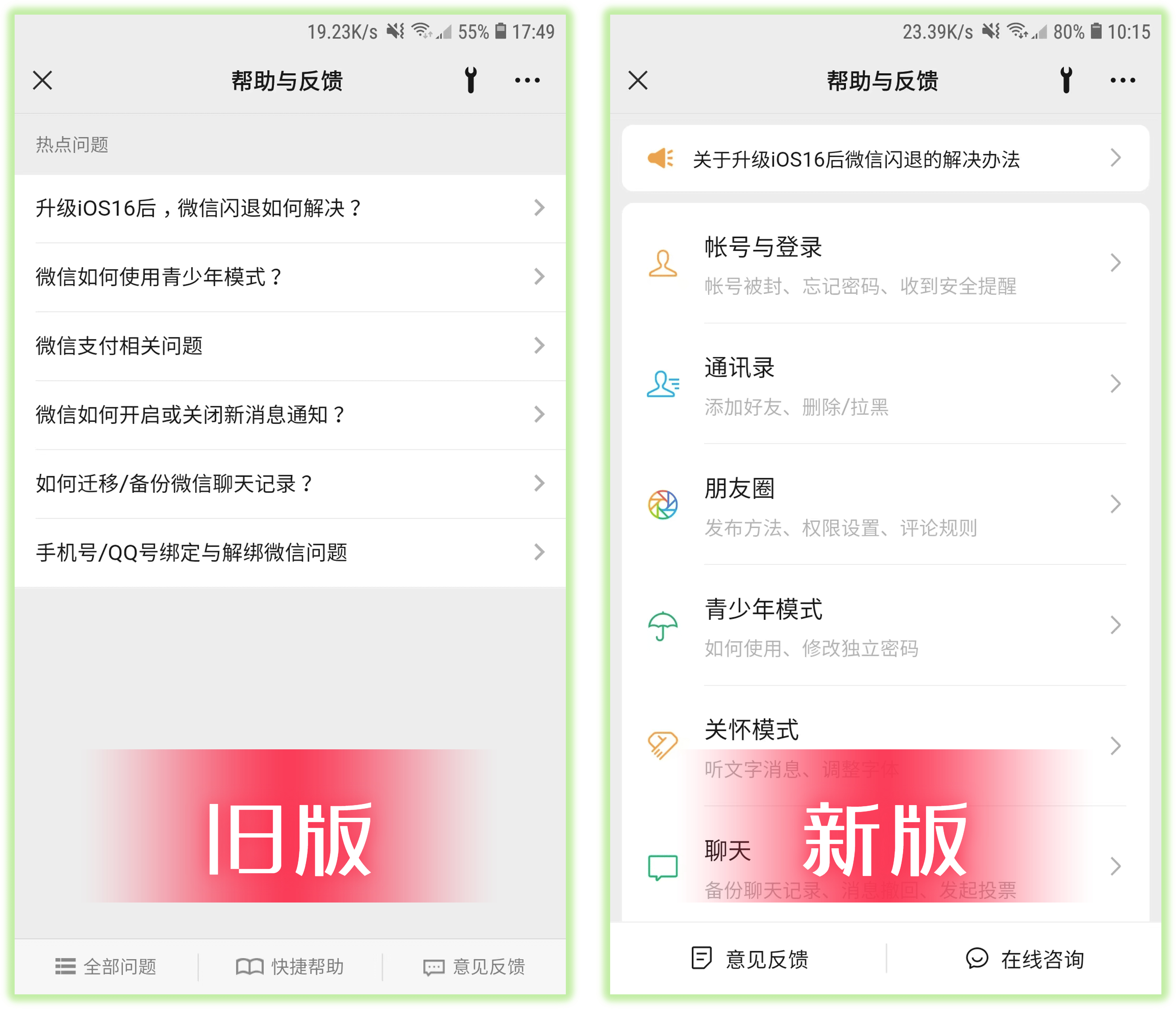 打开微信的【设置】,下拉到底部,这里有个【帮助与反馈】,这个界面如今改版了,将之前的一些热点问题做了归纳,同时还有图标显示,感觉比旧版更清晰、更美观了。