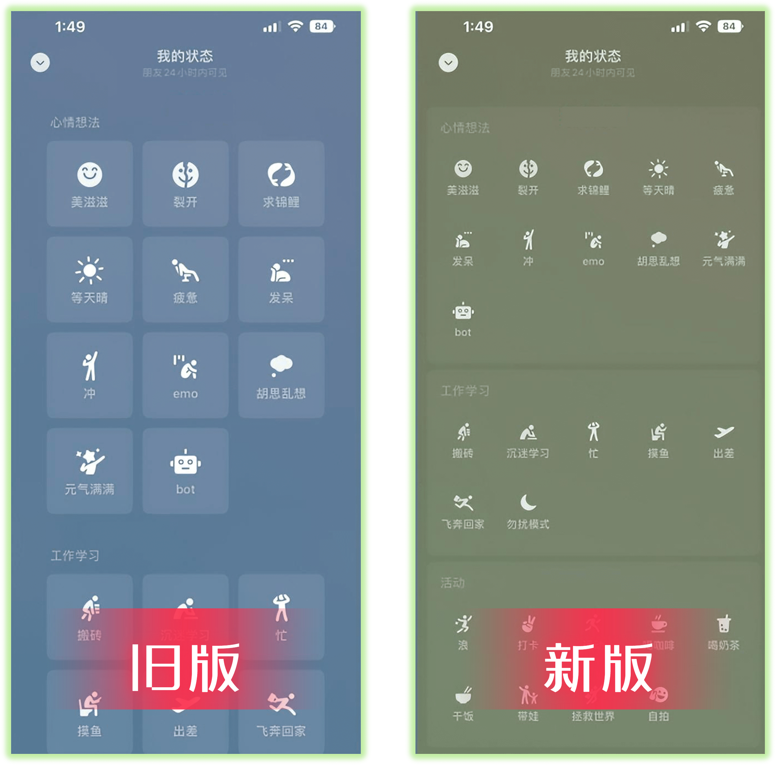微信状态每天都有人在玩,这次更新后,再次打开微信状态面板,所有状态图标都缩小了,在旧版微信里,一行只显示3个状态,现在一行能显示5个状态,一屏就能查看全部。