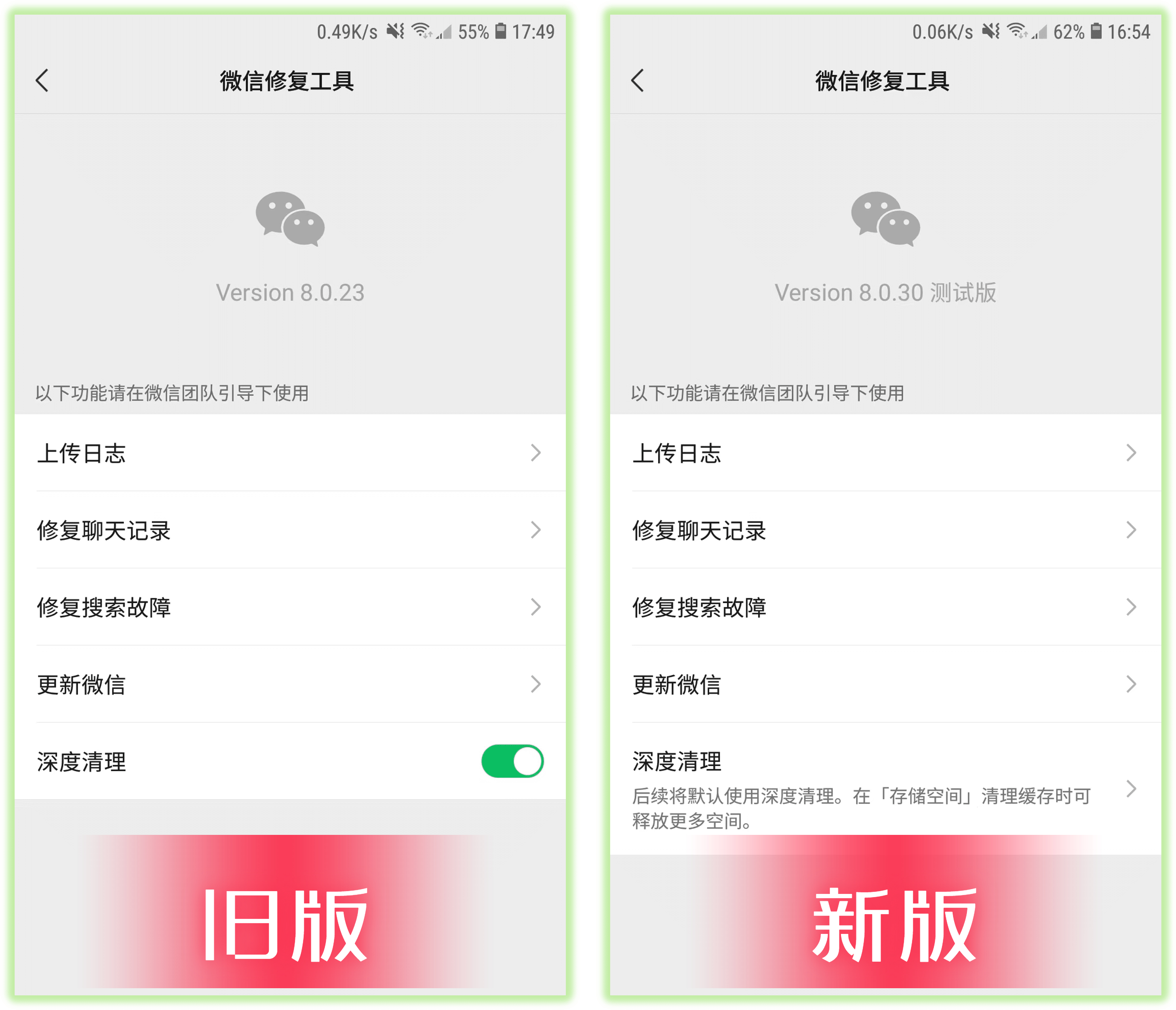 在帮助与反馈的右上角,有个“扳手”图标,点击进入微信修复工具,这里有个【深度清理】功能,以往我们需要手动开启,彻底清理微信缓存,现在直接默认为深度清理模式了。