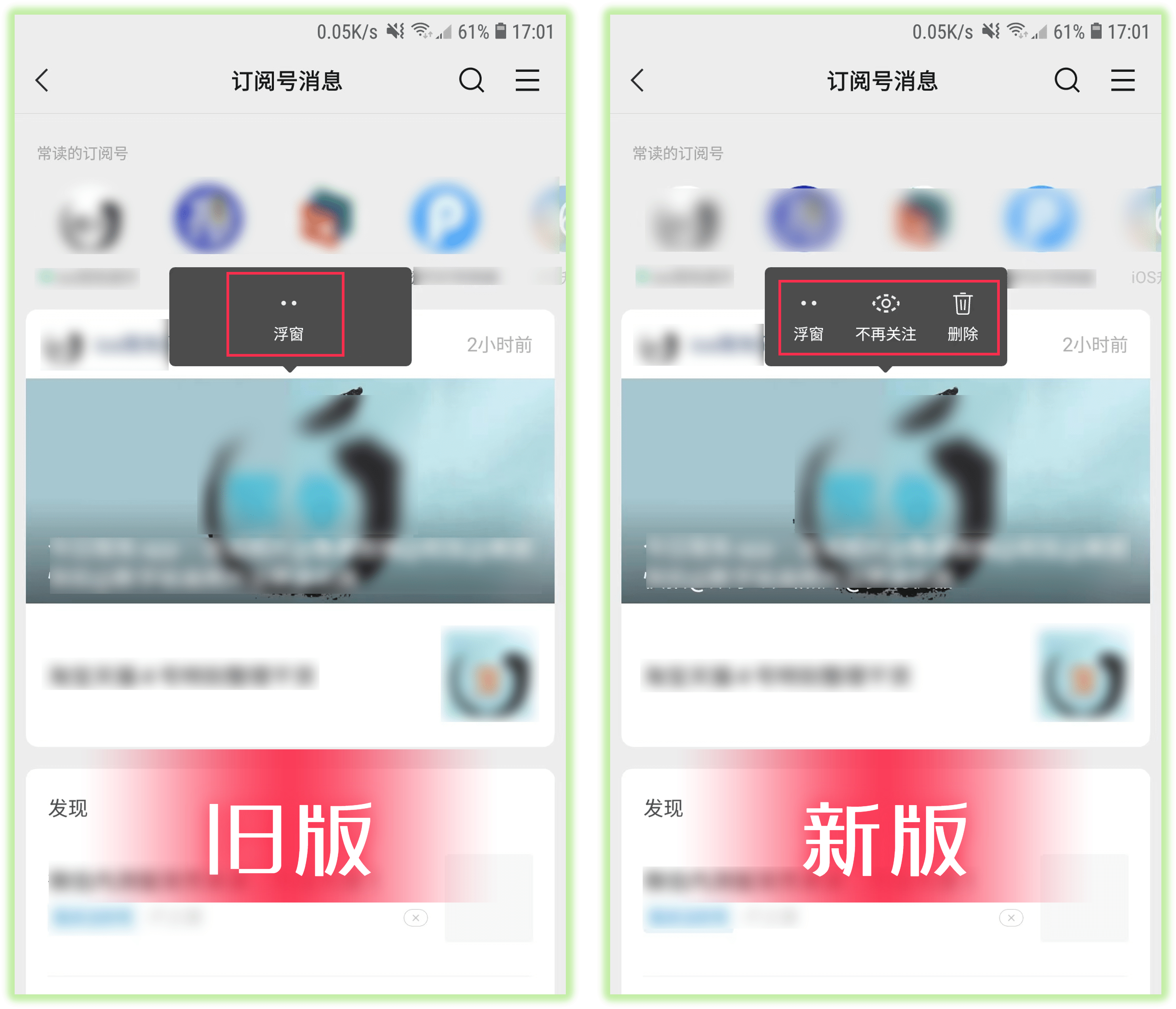 在订阅号消息推送列表,当你长按任意一篇文章时,之前只有一个功能,现在显示3个功能了。浮窗的意思就是稍后阅读,还能直接点击取关,以及删除(不显示)这条群发消息。
