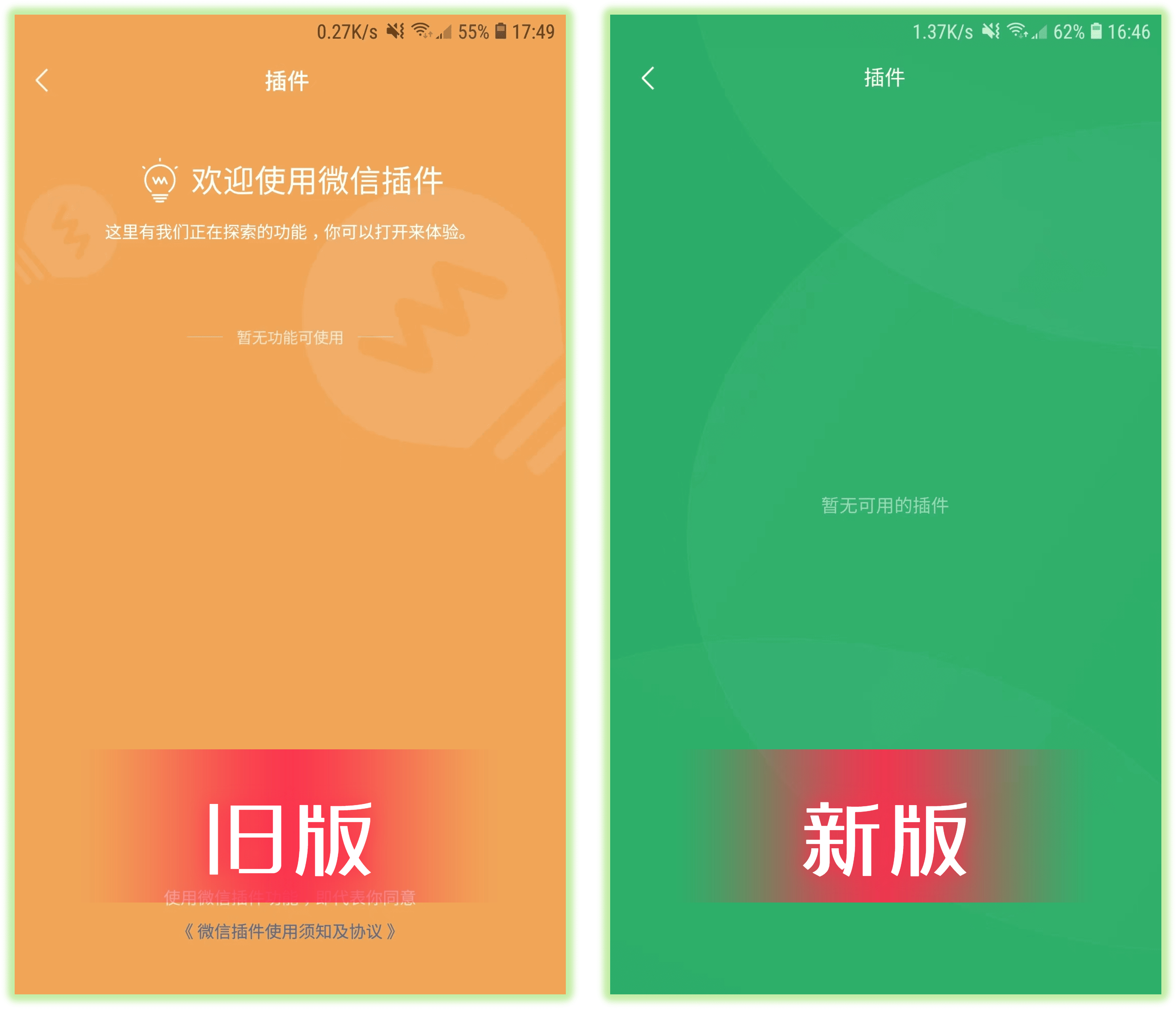 返回到微信设置界面,点击【插件】功能,进入后你会发现,以前的黄色背景现在变成了绿色,而且顶部和底部的文字介绍也被移除了,只留下一片绿布,显示暂无功能可用。