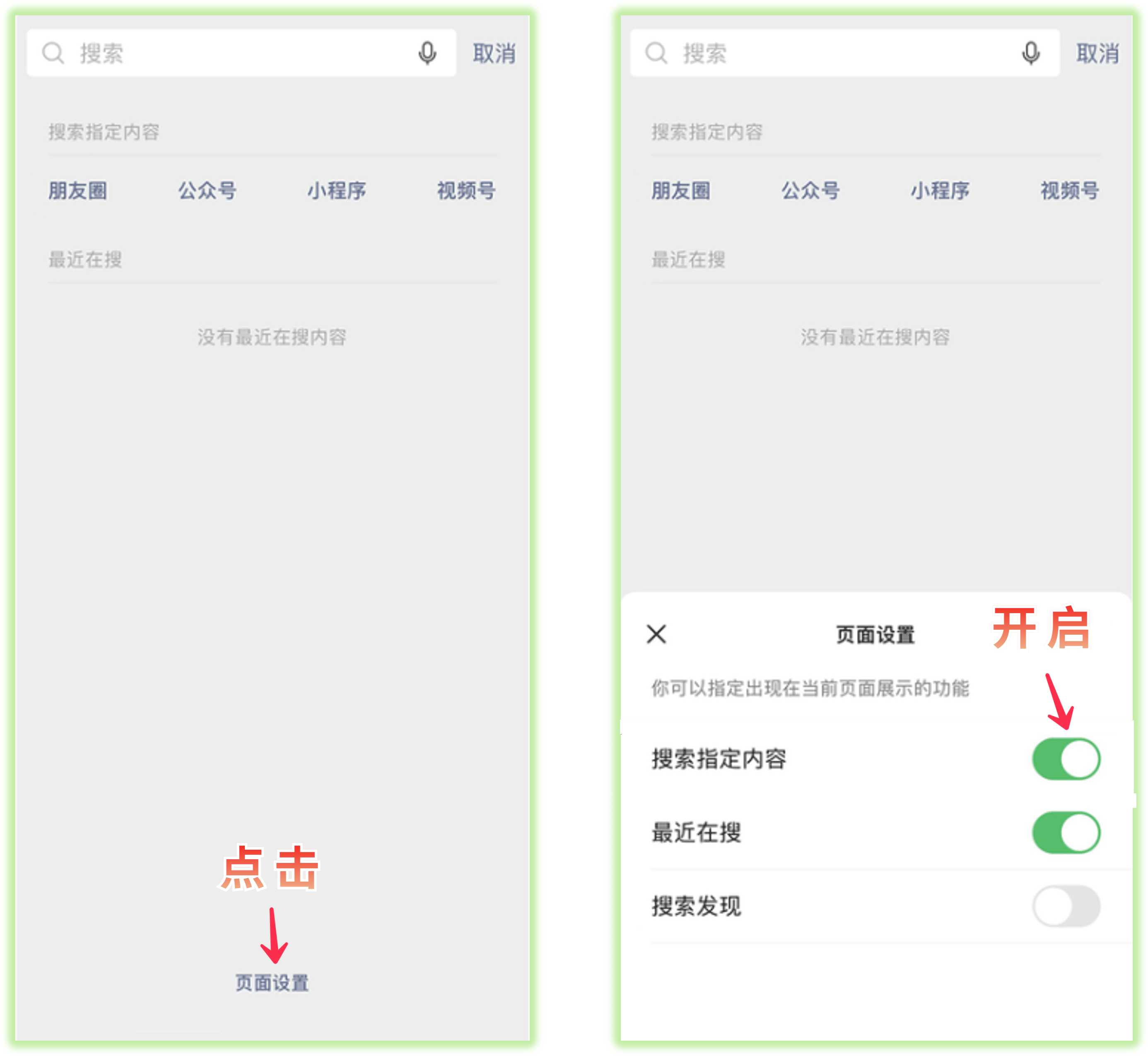微信右上角的“放大镜”图标,点击可以进行全局搜索,底部有个【页面设置】,里面新增了“搜索指定内容”选项,开启后会在搜索框下方显示。