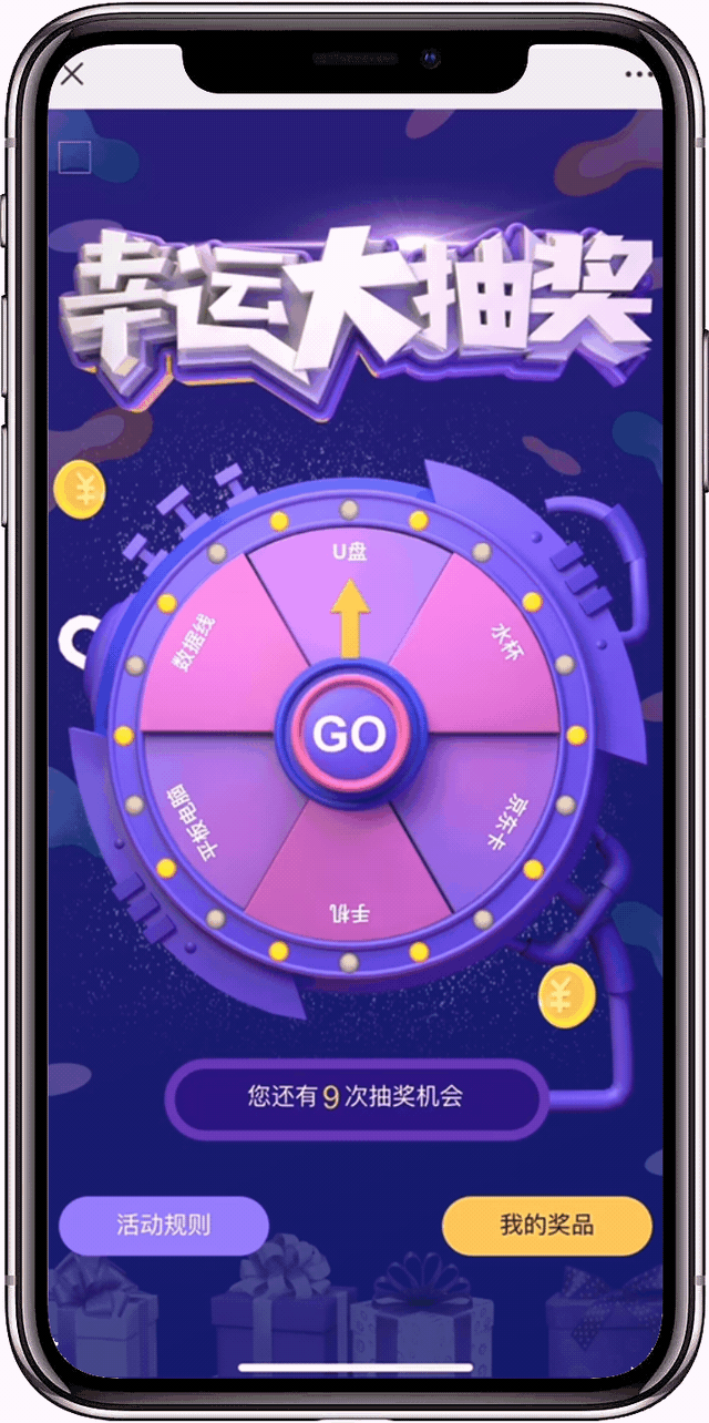 活动中,用户在填写表单后即可进入抽奖。中奖后如果是线上礼品(例如购物卡),管理员在线上直接发送中奖信息;若是实体礼品需要中奖人到线下活动现场来领取礼物,这样能够十分有效地提升线下活动的参与情况。