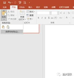 2、找到PPT中你要插入Excel表格的页面,然后在开始菜单中找到粘贴图标下的黑三角,点击后选择“选择性粘贴”。