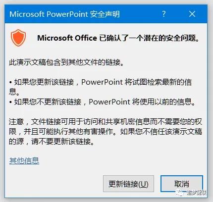 6、如果你在更新Excel数据时,对应的PPT不是打开状态怎么办?没关系的,你打开PPT时会出现底下窗口,你点击“更新链接”按钮就可以了。如果你点击“取消”,那你只能重复步骤5了!不过强烈建议你关闭PPT再打开选择“更新链接”按钮,因为你如果采用步骤5,你得保证所有位置都做到,谁能保证呢?