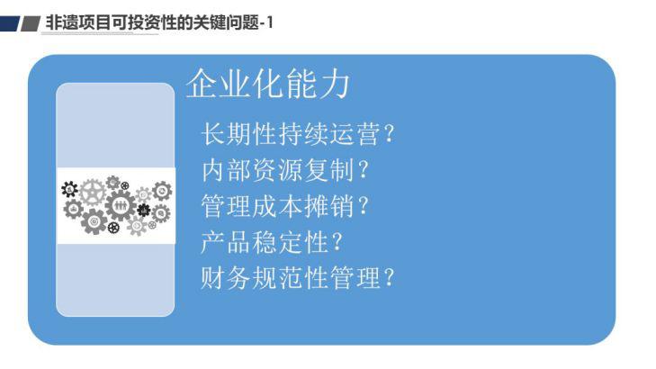 第一,非遗是否可以长期持续性运营。 这是企业的,但并不是个人的。举个极端的例子,例如有一项非遗的技艺,现在传承人是一位80多岁的老先生,并没有把这种技艺有效的传承到下一代人,这种情况下,非遗可就可能失传。但是企业要有永续经营的追求,它希望自己拥有的核心技术也好,知识产权也好,核心能力也好,能够在企业内部传承下去。