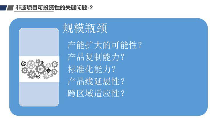这里的规模指的是,随着市场的需求发展,项目的产品供给的扩张能力。从某种程度上来讲,规模的瓶颈,也是当前限制我们的非遗资本化的重要问题。