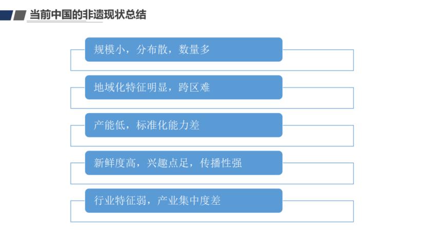 绝大多数的非遗是一些现状很小的项目,例如非遗的手工艺,或者是其他的非遗文创制品,更多的依赖于手工和传统技艺的传承。这里有一个问题,大家可以思考,当一个项目不再是由手工和传统的技艺生产制作的时候,而是工业化批量生产,它还是非遗吗?