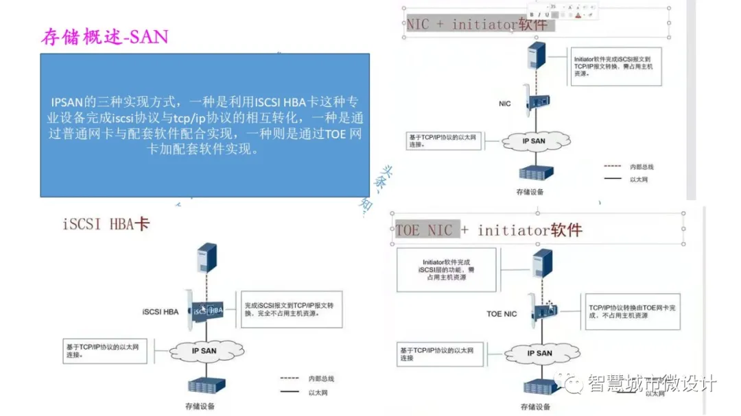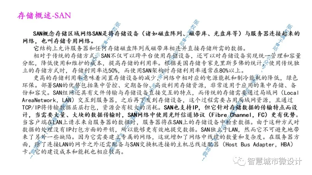 更高的存储利用率意味着闲置存储设备的减少,网络中相对应的电源能耗和制冷能耗的降低,绿色环保。部署SAN的优势包括集中管控、定期备份、高效利用存储资源,非常适用于应用的集中存储、备份和容灾。SAN组网还具有文件传输与存储设备直接交互的特点,而传统的存储需要通过局域网(Local AreaNetwork,LAN)交互到服务器,之后再下发到存储设备,这个过程需要占用局域网资源,且通过TCP/IP将传输数据层层打包,资源会有较大的消耗。SAN也支持IP,但它针对存储数据的传输特点而设计,当需要大量、大块的数据传输时,SAN网络中使用光纤信道协议(FibreChannel,FC)更有优势。当客户端在LAN上请求来自服务器的数据时,服务器将在SAN上的存储设备中检索数据。由于这种方式对数据的处理没有IP打包方面的开销,所以能够更有效地提交数据。SAN独立于LAN,然而它不可避免地带来了另外一些缺陷。因为它需要建立专属的网络,这就增加了网络中线缆的数量和复杂度。在服务器方面,除了连接LAN的网卡之外还需配备与SAN交换机连接的主机总线适配器(Host Bus Adapter,HBA)卡。它的建设成本和能耗也相应较高。