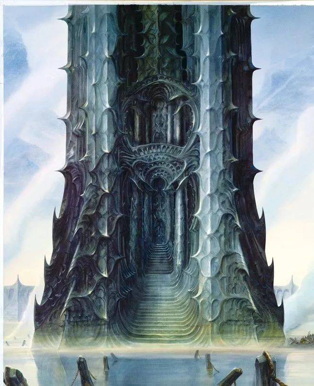 约翰•豪:哦,从来不会,绘图过程中我还是很能克制情绪的。你知道,我设计了索伦的黑塔巴拉督尔,那是自第一纪元末安格班在愤怒之战中被摧毁以来建成的最大的堡垒,由于索伦不能再以实体现身,黑塔既是他力量的象征,也是他在尘世间的牢狱。刚开始创作时,我在巨大尺幅的纸上作画,从那个塔的最底部开始设计,一直往上画,但我也不知道顶部会是什么样,直到我大概想清楚,因为我一直画一直画,这个塔已经变得很高很高。我特别享受这个过程,我喜欢营造一种创作环境,想象自己站在高远处,画下我所看见的,然后一步步靠近,再从近处看更多细节,最后陆续把工作做完,我发现这个方法有点像地理学考察,但对我很管用。