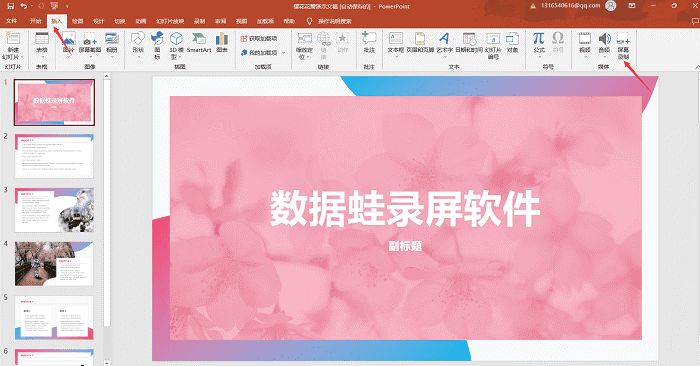 步骤1:打开PPT文件,选择“插入”并在下方的菜单栏右侧,点击“屏幕录制”,将会自动跳出录屏界面;