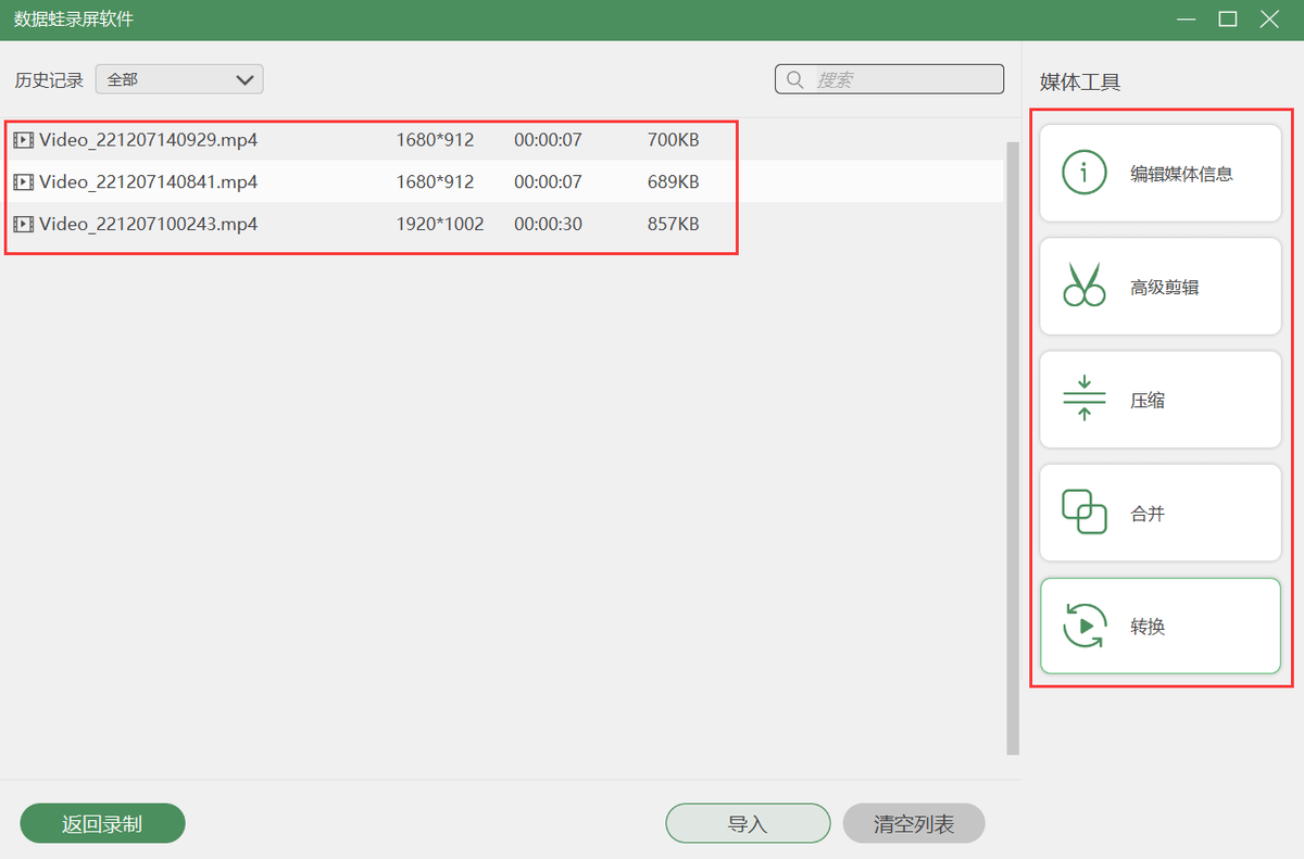 备注:如果您有对视频进行压缩、合并或者是转换格式的需求,都可以在“历史记录”上,点击使用这些媒体工具。