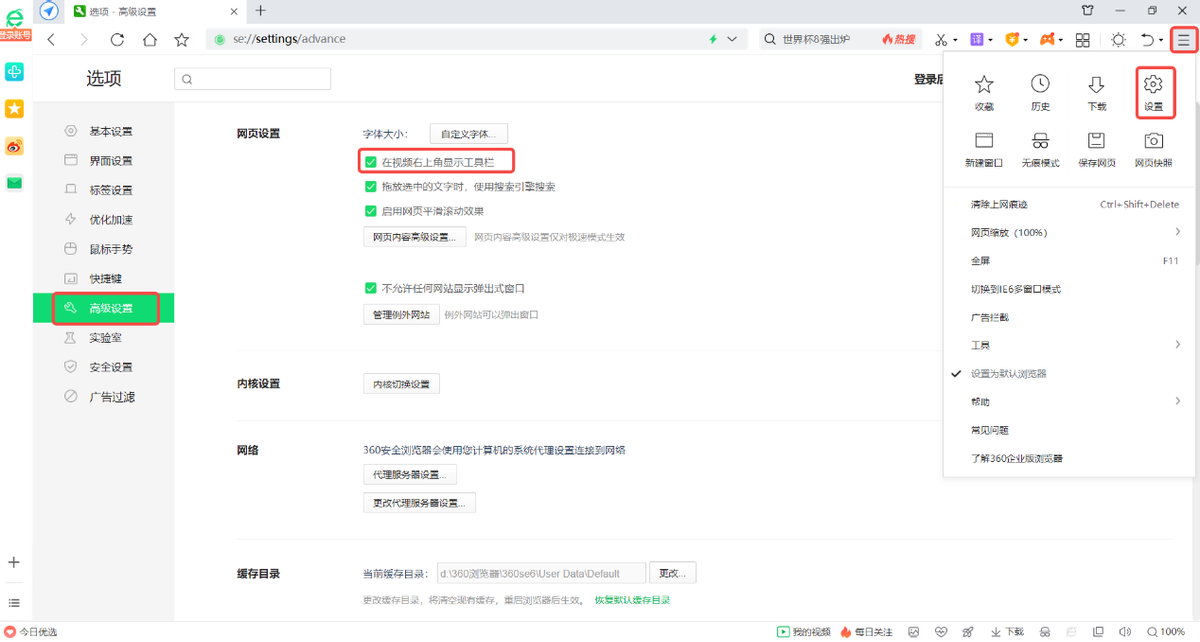 步骤1:打开浏览器设置,在设置选项中选择“高级设置”;将启用“在视频右上角显示工具栏”录屏工具;