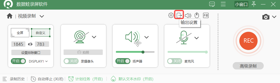 步骤3:设置完成后,选择需要录制的区域范围(可全屏/可自定义区域);如果您有真人出境的需求,可以开启“摄像头”进行录制;根据个人录制需求,选择开启要录制的声源和水印功能,并点击“REC”开始录屏;