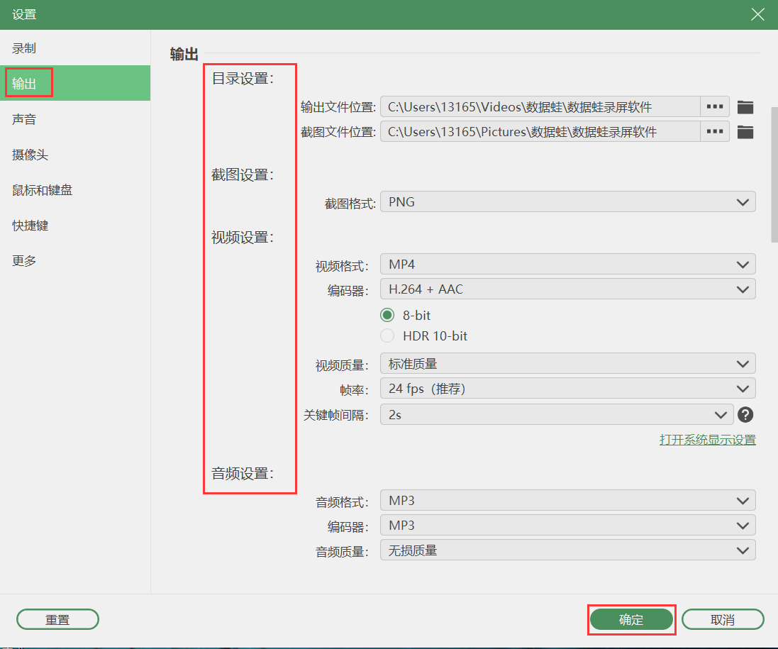 步骤2:可以在录屏前,点击“视频录制”模式中“输出设置”来调整视频录制参数。比如视频的输出位置、截图格式、视频格式、视频质量、帧率、麦克风降噪等等;