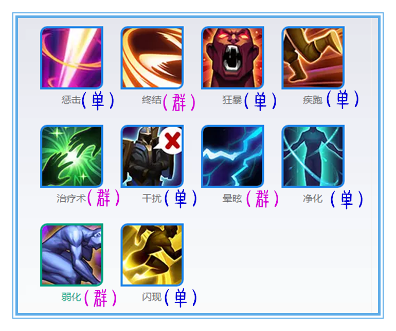 范围类的召唤师技能的则更多的体现在团战上面:如果想终结对手可以选择斩杀;如果想治疗队友就选择治疗术;如果想增加控制效果就选择晕眩;如果想削弱对手则可以选择弱化。